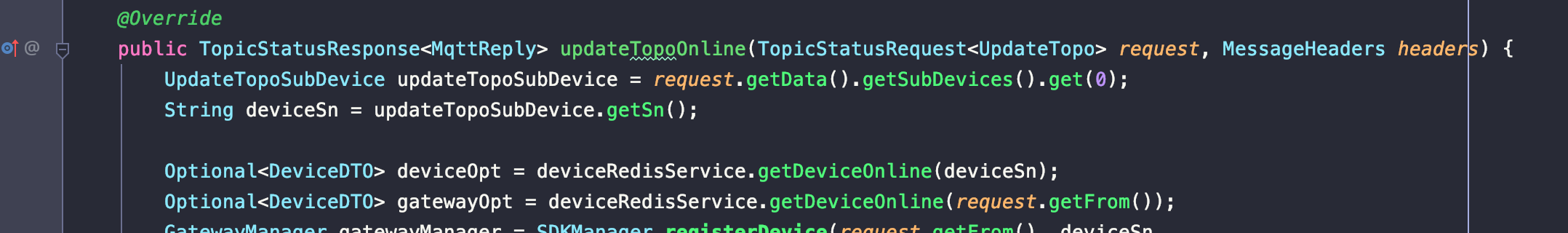 • 重写方法updateTopoOnline,实现设备上线功能。