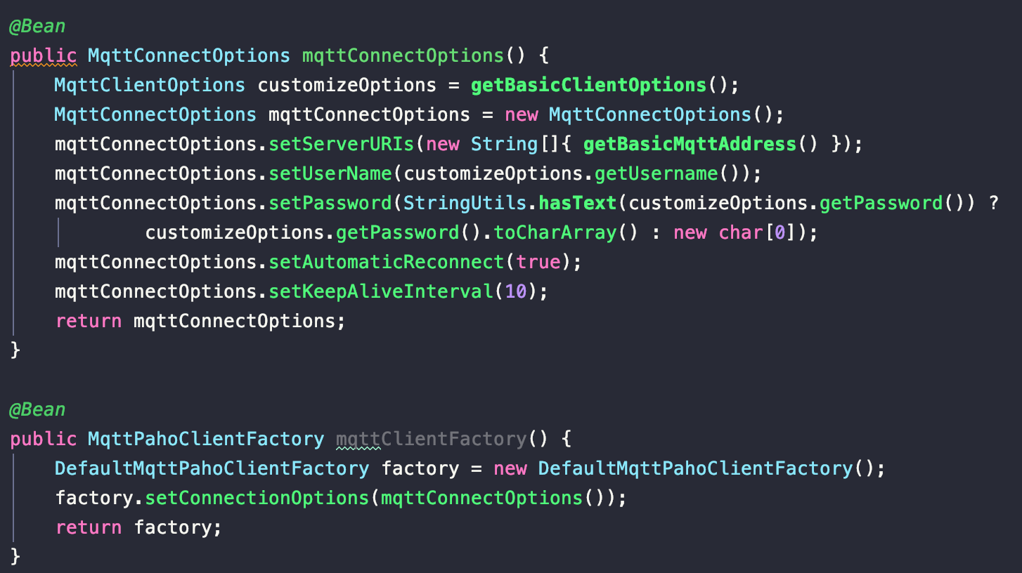 • 在spring容器中注入MqttConnectOptions和MqttPahoClientFactory;