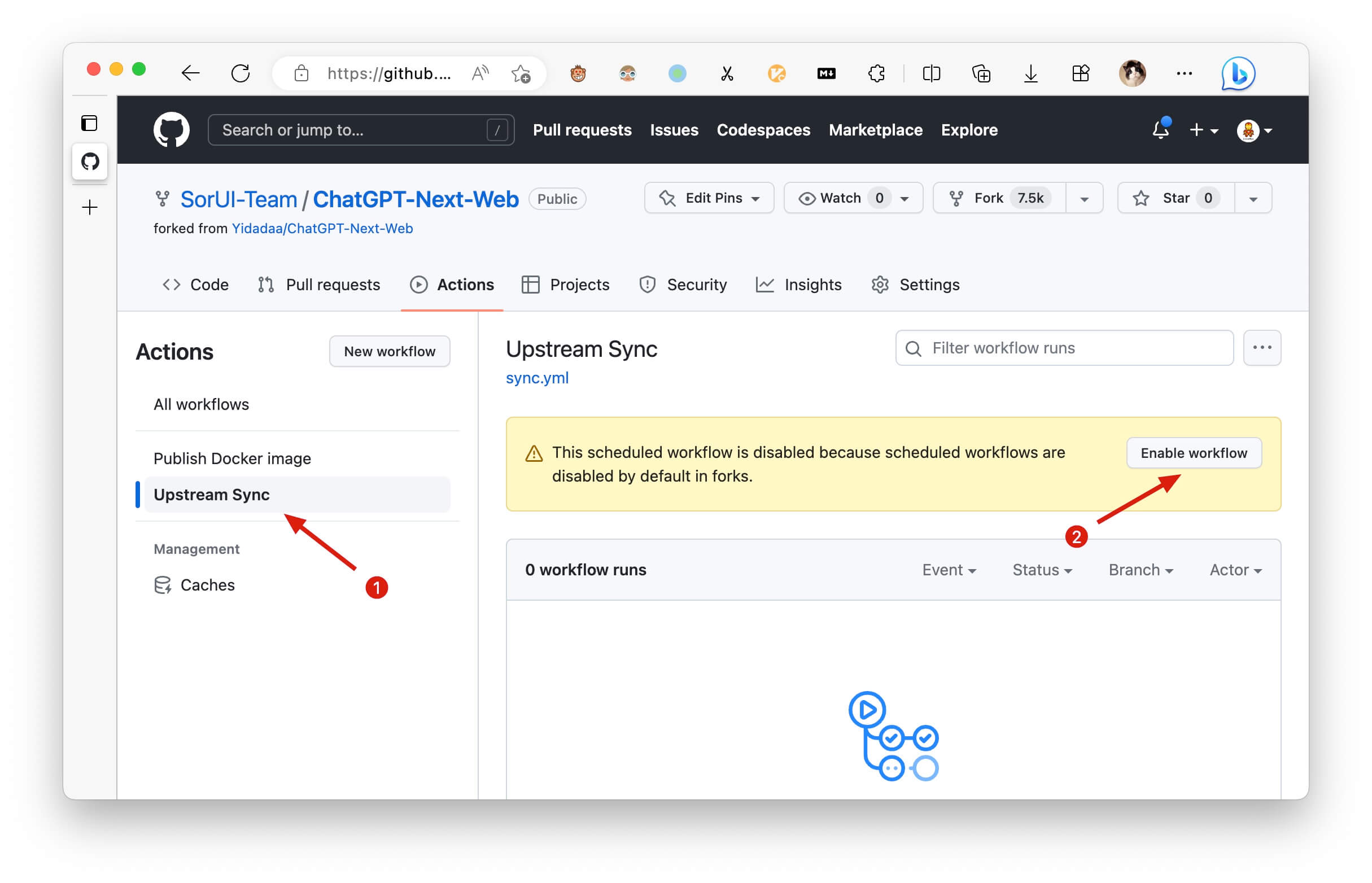 当你 fork 项目之后,由于 Github 的限制,需要手动去你 fork 后的项目的 Actions 页面启用 Workflows,并启用 Upstream Sync Action,启用之后即可开启每小时定时自动更新: